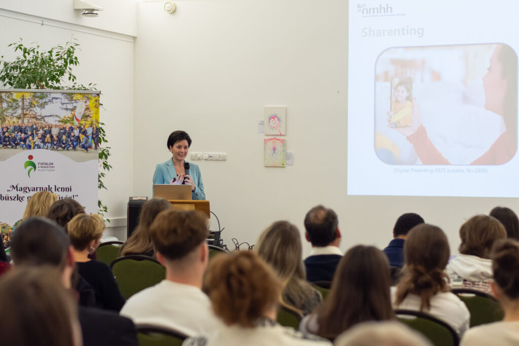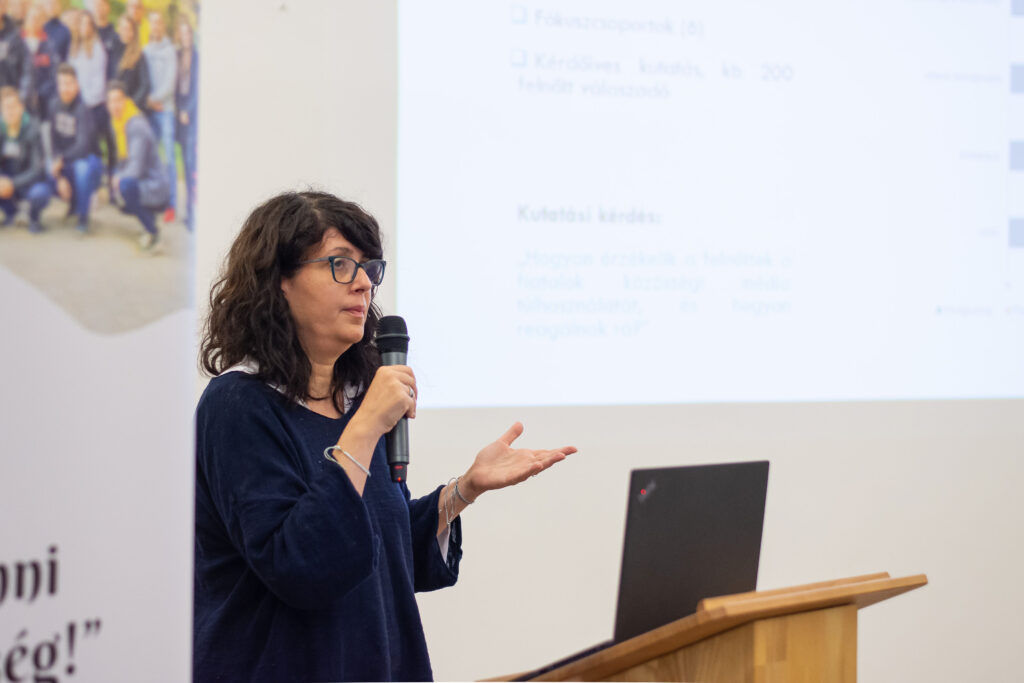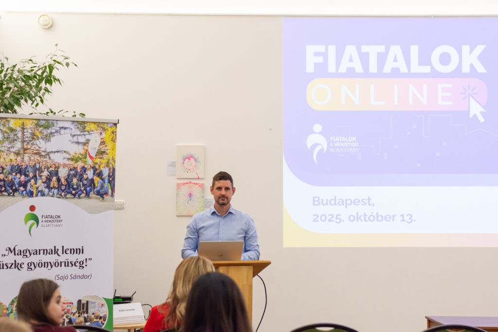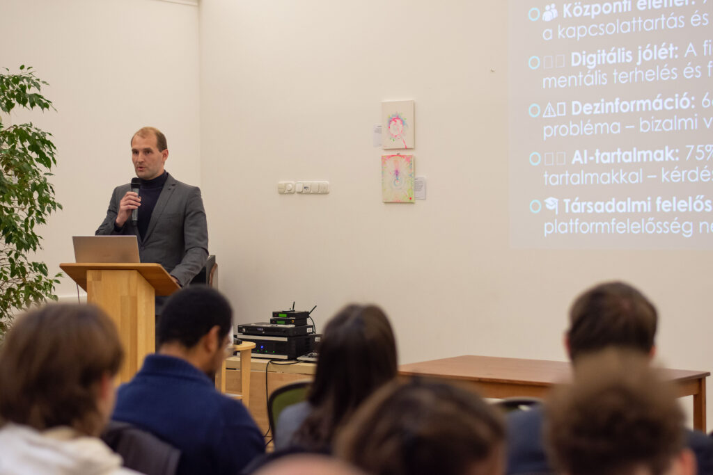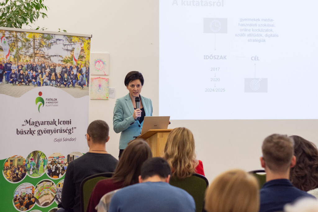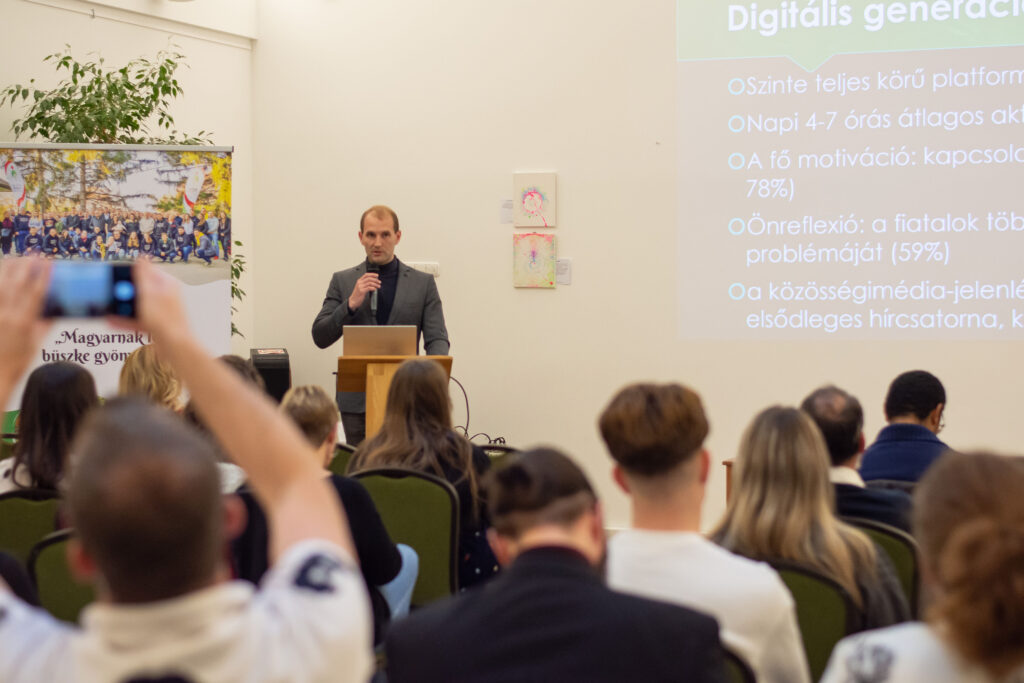 Elsőként Kovács János politológus-kutató összegezte a Fiatalok a Nemzetért Alapítvány által ebben a témában készített kutatás főbb megállapításait. A kérdőívet összesen 2031 fő töltötte ki a 14-30 éves korosztályból online és személyesen a nyári ifjúsági fesztiválok alkalmával. Közülük 94% tartja magát „aktív” közösségimédia-használónak, míg 75% találkozik rendszeresen a mesterséges intelligencia által készített tartalmakkal, illetve 66% pedig a dezinformációt (álhíreket) tartja a legnagyobb problémának. Főként ez utóbbival kapcsolatban tartják szükségesnek (51%) a közösségi média szigorúbb szabályozását és az újfajta digitális kompetenciák erősítését. Emellett az is kiderült, hogy – saját bevallásuk szerint – átlagosan napi 4-7 órát töltenek a virtuális térben, amit zömmel kapcsolattartásra (78%) és szórakozásra (78%) fordítanak. Ugyanakkor érzik (58%) magukon a túlhasználat jegyeit is. Elsődlegesen itt „fogyasztanak” híreket, ahol jelentős hangsúlyt kap a közvetett (pl. szerkesztett videókból történő) információszerzés. A válaszokból kiolvasható még, hogy a családjaik mellett a pedagógusok felelősségét jelölik meg kiváltképp a felelős médiahasználatra való neveléshez. Közelebbről megvizsgálva viszont látható, hogy a fiatalok között is tapasztalható különbség: míg a „Z” generációt (18-30 év) általánosságban véve egyfajta reális tudatosság jellemzi, addig a legújabb „alfa” generációt (14-18 év) inkább a trendkövetés motiválja. Következtetésként az érintett szakmai szervezetek és politikai döntéshozók irányába a generációspecifikus kritikai gondolkodásmód fejlesztését (pl. a hiteles információk és a mesterséges intelligenciával készített tartalmak felismerését), a családok és pedagógusok mellett az ifjúsági szervezetek szerepének erősítését, valamint a népszerű influenszerek bevonását és országos kampányok elindítását lehet kiemelni főképpen az online zaklatás, az adatvédelmi kockázatok, illetve a gyűlöletbeszéd eredményes megelőzésére.