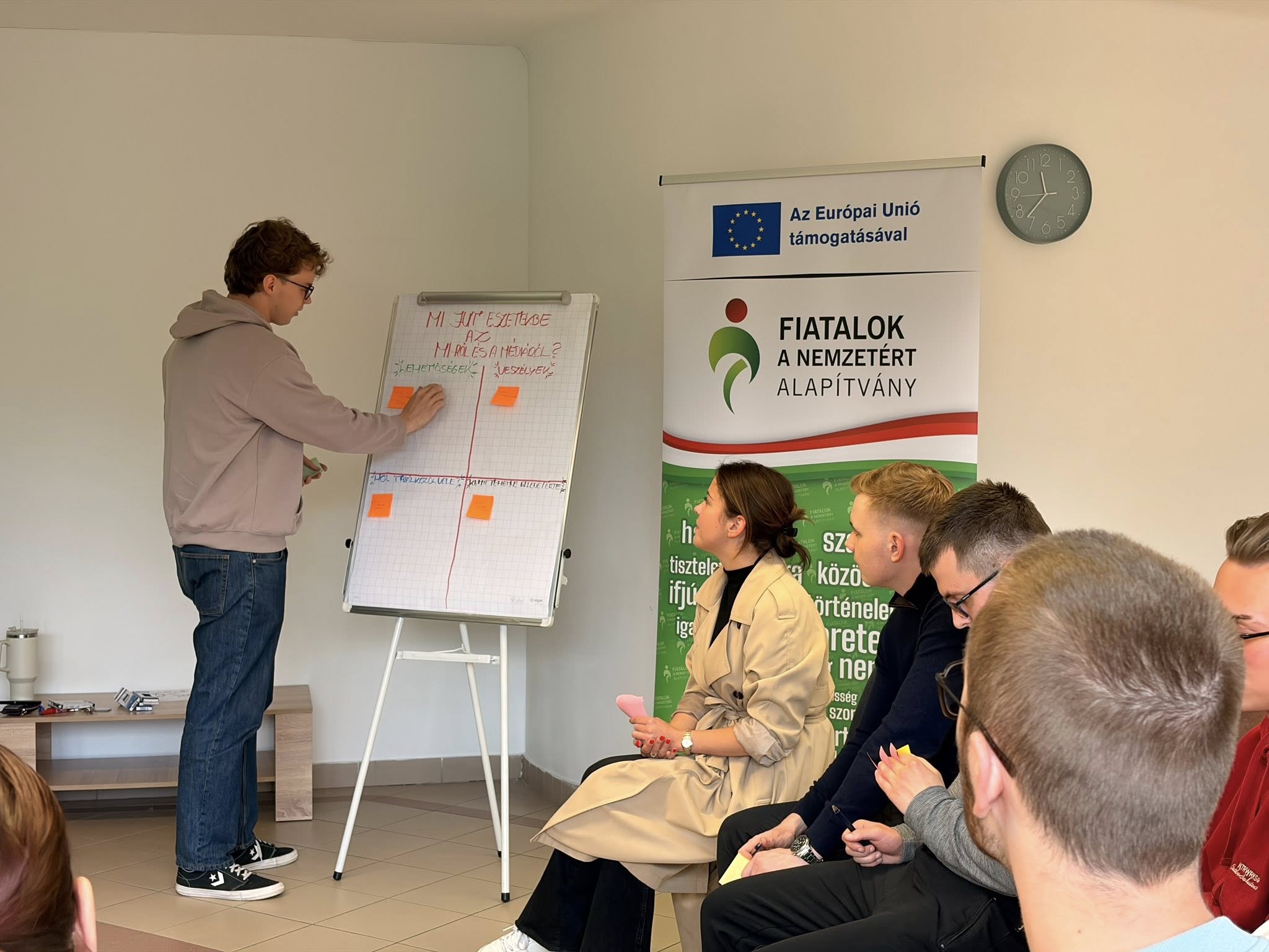 A program felépítése az előző alkalmakhoz hasonlóan alakult: a résztvevőkkel közösen térképeztük fel, hogyan látják a mesterséges intelligencia szerepét a médiában. Megvizsgáltuk az általuk érzékelt előnyöket és lehetőségeket, a felmerülő kockázatokat, valamint azt is, mennyire képesek felismerni az MI által generált tartalmakat. Szó esett arról is, hogyan formálja az MI a közösségi média működését, és milyen hatással lehet a jövőben az információszerzésre és a véleményformálásra.