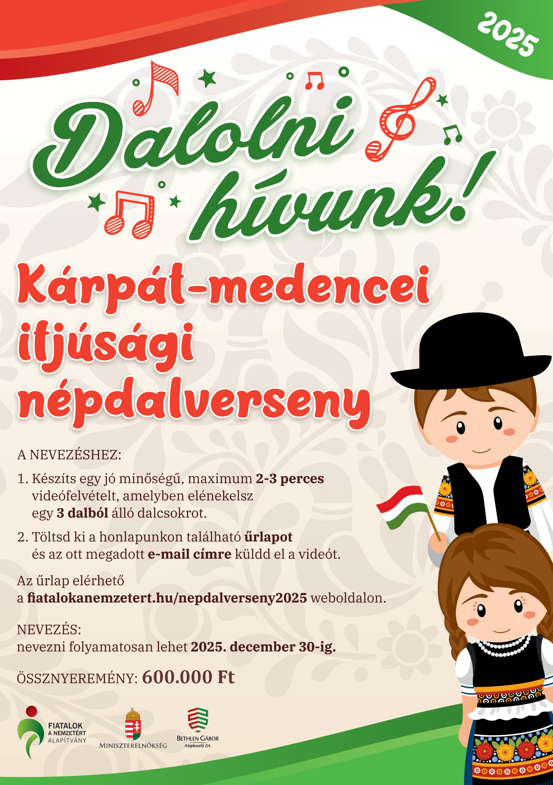 A Fiatalok a Nemzetért Alapítvány 2021 után 2025 őszén ismét meghirdeti nagysikerű népdalversenyét, melyre az egész Kárpát-medencéből várjuk a dalos kedvű általános és középiskolás fiatalok jelentkezését.