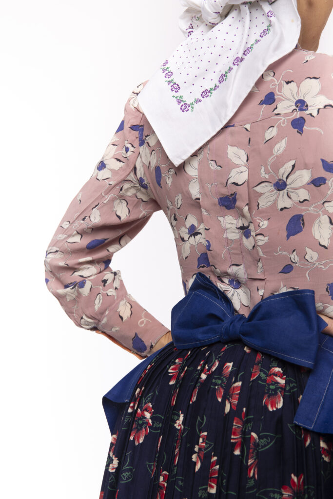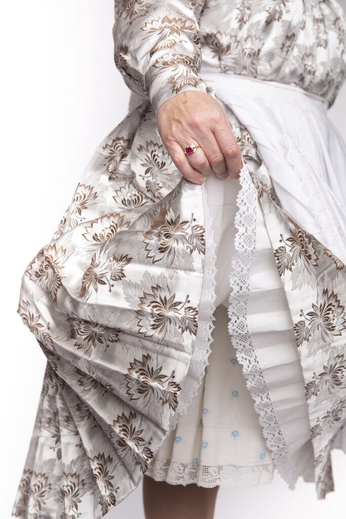 A fiatal női viselet legkülönlegesebb öltözéke a nagyünneplős, melynek egyediségét a brokát selyem anyag, valamint a szín- és mintavilág adta.