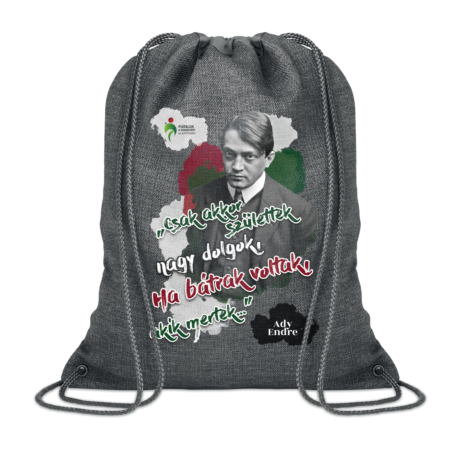 A mindennapok praktikus kiegészítője ez a tornazsák, amelyet használhatsz kisebb bevásárláshoz, könnyebb sportfelszereléseid szállításához, vagy épp belerakhatod legfontosabb tárgyaidat, ha elmész otthonról. Anyaga 100% poliészter. Összehajtva kis helyet foglal, ha épp üres, kinyitva pedig sok minden belefér. Mindezt Ady Endre iránymutatásával: „Csak akkor születtek nagy dolgok, Ha bátrak voltak, akik mertek”.
